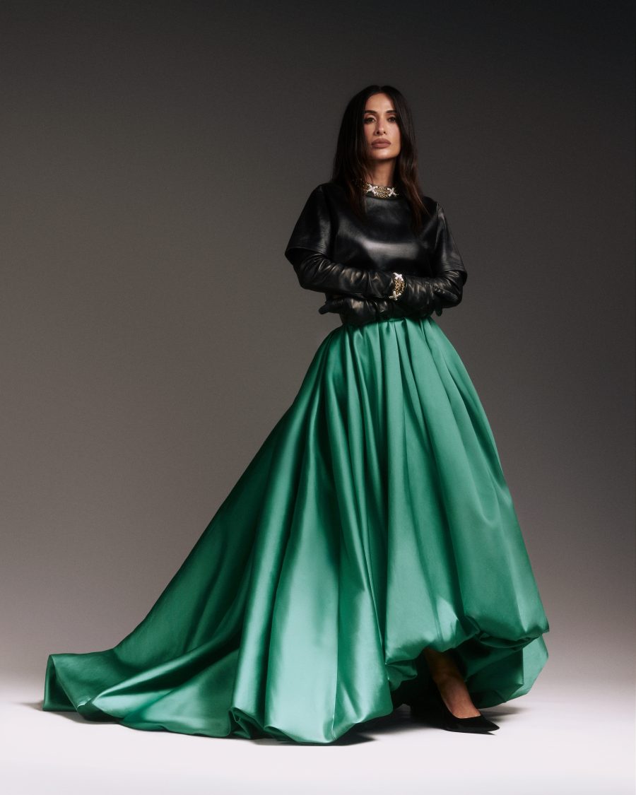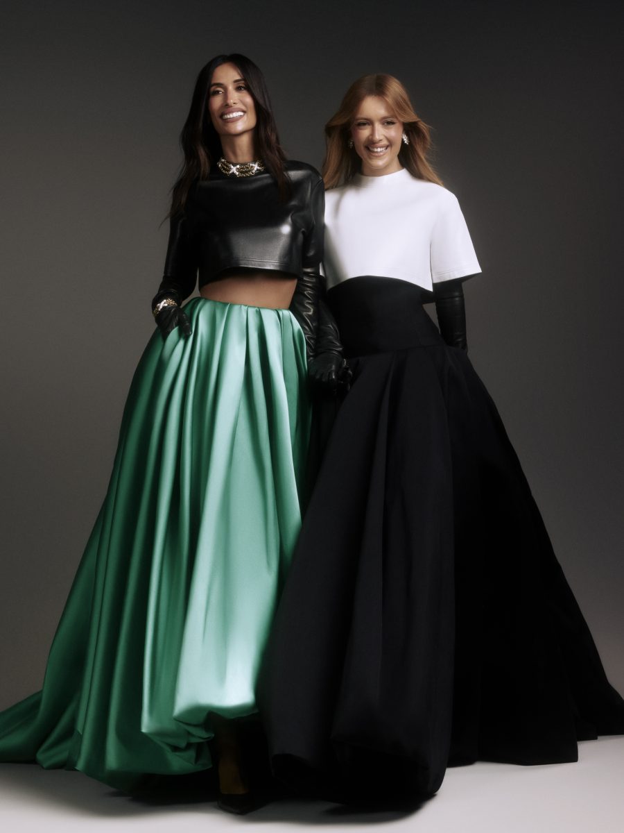 Silvia vestiu um top cropped de couro com mangas longas, combinado à saia ampla em verde, criando um visual de presença e atitude. As joias escolhidas para complementar o look foram da Tiffany, maison da qual Silvia é a única embaixadora de alta joalheria no Brasil. Já Maria seguiu uma proposta igualmente estruturada, com top em branco sobreposto a uma saia preta de grande volume. Em comum, as luvas pretas longas surgem como elemento-chave, reforçando a unidade entre os looks e trazendo um toque de sofisticação dramática às produções.